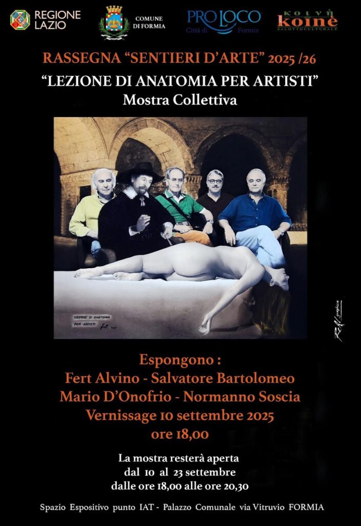 Prende il via a Formia la rassegna “Sentieri d’Arte 2025/2026” con l’inaugurazione della mostra “Lezione di anatomia per artisti“. L’esposizione, a ingresso libero, sarà ospitata presso il Punto IAT del Palazzo Comunale dal 10 al 23 settembre, e vedrà il confronto artistico tra Fert Alvino, Salvatore Bartolomeo, Normanno Soscia e Mario D’Onofrio.