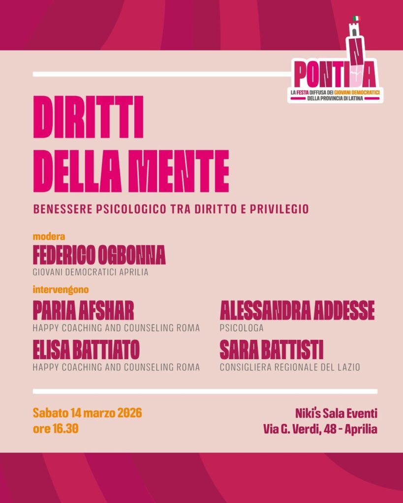 “A Pontina – recita una nota dei Giovani Democratici di Aprili – ne parliamo insieme con un incontro dedicato al benessere psicologico, tra diritti, ascolto e accessibilità. Perché stare bene non deve dipendere dalla fortuna, dai soldi o dal contesto in cui vivi”.