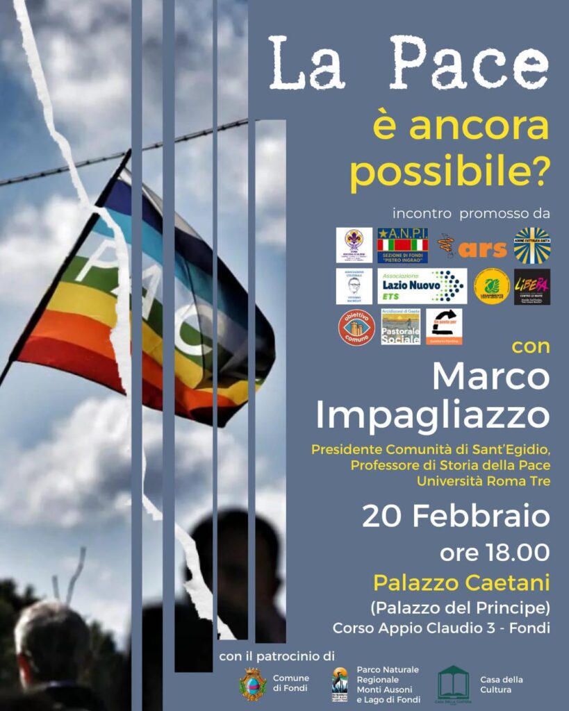 Il convegno, che si terrà venerdì 20 febbraio alle 18.00, presso il salone di Palazzo Caetani, in Corso Appio Claudio 3 a Fondi. è organizzato da una serie di realtà locali: AGESCI – Scout Fondi 1, ANPI sezione di Fondi Pietro Ingrao, ARS – Arte, Ricerca e Sperimentazione, l’Azione Cattolica diocesana di Gaeta e delle parrocchie di Fondi, l’associazione culturale intitolata a Vittorio Bachelet, l’associazione Lazio Nuovo, il circolo intercomunale di Legambiente, il presidio di Libera, l’associazione di cultura politica Obiettivo Comune, la Pastorale Sociale dell’Arcidiocesi di Gaeta e “Un ponte per”. Accanto a loro non mancano i patrocini del Comune di Fondi, del Parco Naturale Regionale Monti Ausoni e Lago di Fondi e del comitato promotore della Casa della Cultura