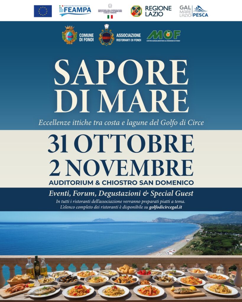 Fondi si prepara a vivere tre giorni all’insegna del gusto, della tradizione e del mare. Dal 31 ottobre al 2 novembre 2025, la città ospita “Sapore di Mare – Eccellenze Ittiche tra Costa e Lagune del Golfo di Circe”, un evento che celebra la ricchezza gastronomica della Riviera di Ulisse e l’arte dei cuochi fondani, capaci di trasformare il pescato locale in autentiche esperienze di gusto. L’iniziativa nasce grazie alla collaborazione tra il Comune di Fondi, l’Associazione Ristoratori Fondani e il MOF, con il sostegno di Regione Lazio, GAL Mare Lazio, FEAMPA e del Parco Naturale Regionale Monti Ausoni e Lago di Fondi. Una sinergia che unisce istituzioni e territorio nel segno della valorizzazione delle eccellenze ittiche e della cucina di qualità. “Sapore di Mare” è più di una rassegna gastronomica: è un racconto del mare e delle sue genti, un dialogo tra la tradizione dei pescatori e la creatività dei cuochi. Per tre giorni, l’Auditorium comunale “Sergio Preti” e il Chiostro di San Domenico diventeranno il cuore pulsante di una manifestazione in cui profumi, sapori e parole si intrecceranno in un percorso che unisce conoscenza, convivialità e cultura. Tra incontri, cooking show e degustazioni, il pubblico potrà scoprire quanto il mare sia protagonista della tavola fondana e quante storie sappia raccontare attraverso i suoi piatti. Il 31 ottobre, ad aprire la manifestazione sarà il convegno “Dal blu della Riviera di Ulisse alla tavola fondana: un’esperienza di gusto e passione”, con la partecipazione del professor Giuseppe Nocca, moderato dal giornalista Antonio Di Trento. Seguirà la prima “Pizza e Mare Experience” con Vincenzo Cocozza, che porterà in degustazione impasti e sapori che profumano di mare.