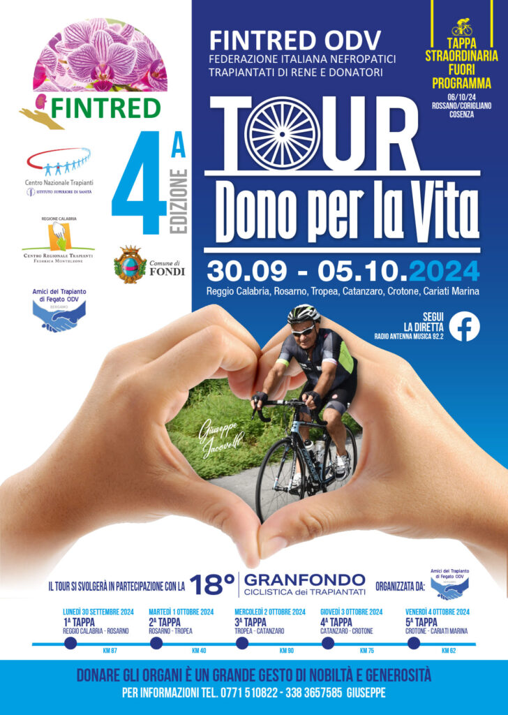 Il tour del 2024, che si svolgerà in compartecipazione con la 18° Granfondo ciclistica dei trapiantati, interesserà, dal 30 settembre al 5 ottobre, la Calabria con cinque tappe: Reggio Calabria Rosarno, Rosarno Tropea, Tropea Catanzaro, Catanzaro-Crotone, Crotone-Cariati Marina. Il 6 ottobre si terrà infine una tappa straordinaria a Rossano, Corigliano e Cosenza. Giuseppe Iacovelli porterà personalmente, in sella alla sua bici, la sua testimonianza di trapiantato ma anche le storie di vita e di rinascita raccolte in tanti anni di militanza con la FINTRED. L’iniziativa, che gode del patrocinio e del contributo del Comune di Fondi, sarà seguita in diretta da Radio Antenna Musica 92.2.