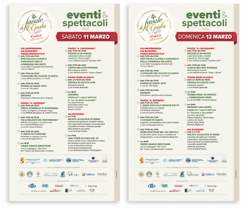 Novità di oggi, lo show cooking a cura dell’IPSEOA “Celletti” di Formia, che si svolgerà in Piazza della Libertà (fronte Infopoint) e sarà legato soprattutto al pescato, ai prodotti realizzati con grano e derivati e all’utilizzo del sale come metodo di conservazione fin dall’antichità; i piatti presentati saranno gli spaghetti con le alici, lo sgombro con cime di rape e nocciole e il branzino al sale. In Piazza Sapienza, il professor Giuseppe Nocca converserà sul “Pesce di stagione” e “I cozzari di Gaeta”, mentre lo storico Cosmo Di Russo affronterà il tema del mare e le diverse tradizioni alimentari con “Tra le religioni del Mediterraneo” e “Non solo infinite rotte”; domenica 12, inoltre, il biologo Adriano Madonna affronterà la tematica della vita nelle nostre acque e dei problemi di ossigenazione con “Mare Nostrum nel XXI Secolo”; la compagnia “Life Crew” del Centro del Movimento di Gaeta si esibirà, invece, a partire dalle 18:30. Piazza Capodanno sarà sempre ricca di giochi “di ieri e di oggi” e laboratori ludico-creativi per i più piccoli, con “Pazzielle in Piazza”; e di storia, con la rievocazione “Caieta nell’età romana”, a cura dell’Associazione “Sogni e Spade”. Le note di “Favole di Gusto live” e di Radio Spazio Blu accenderanno Piazza Mare all’Arco dalle 16:00, per poi lasciare spazio alla musica di “Folk&Trad” con Aranira, in “La via delle tarantelle”; domani, alle 17:30, appuntamento con lo spettacolo di danza “Rumba degli scunnizzi e tammurriata nera”, a cura dell’ASD Universo Danza, al quale seguirà il concerto dei Briganti dell’Appia in “Taranta e tarantelle”.