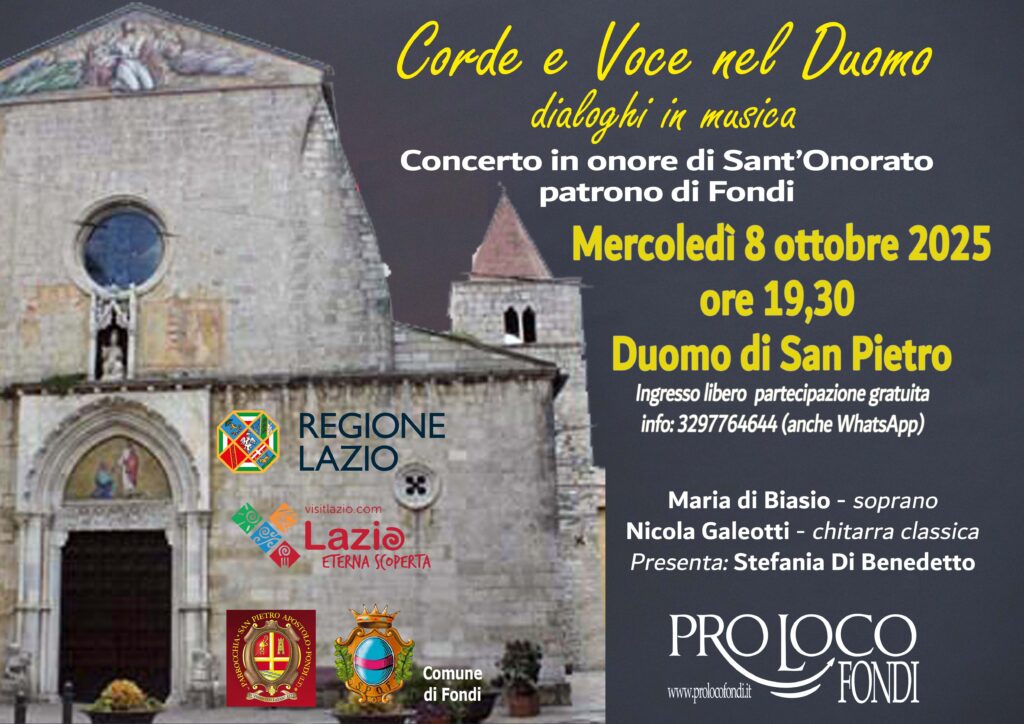 In occasione dei festeggiamenti in onore di Sant’Onorato, patrono della città, l’Associazione Pro Loco Fondi, in collaborazione con la Parrocchia di San Pietro Apostolo, presenta “Corde e Voce nel Duomo – Dialoghi in musica”, un evento che unisce arte, spiritualità e cultura nella cornice senza tempo del Duomo di San Pietro. L’appuntamento è fissato per mercoledì 8 ottobre 2025 alle ore 19.30 e vedrà protagonisti due interpreti di straordinaria sensibilità: il soprano Maria di Biasio e il chitarrista classico Nicola Galeotti. La serata sarà condotta da Stefania Di Benedetto. Il concerto propone un percorso sonoro che attraversa i secoli, dalle arie sacre e liriche alle più raffinate pagine del repertorio da camera, in un continuo dialogo tra voce e chitarra. Un linguaggio universale capace di elevare l’animo e di restituire, attraverso la musica, la profondità del sentimento religioso e la ricchezza della tradizione fondana. «Con questo appuntamento – dichiara Gaetano Orticelli, presidente della Pro Loco Fondi – vogliamo offrire alla nostra comunità e ai visitatori un momento di autentica bellezza, che unisce il valore artistico alla dimensione spirituale. “Corde e Voce nel Duomo” nasce dal desiderio di valorizzare il talento dei nostri artisti e, al tempo stesso, di promuovere il patrimonio culturale e religioso di Fondi. Ringraziamo la Parrocchia di San Pietro, la Regione Lazio VisitLazio per la collaborazione e il sostegno a un’iniziativa che celebra la nostra identità e la forza della musica come linguaggio di comunione».