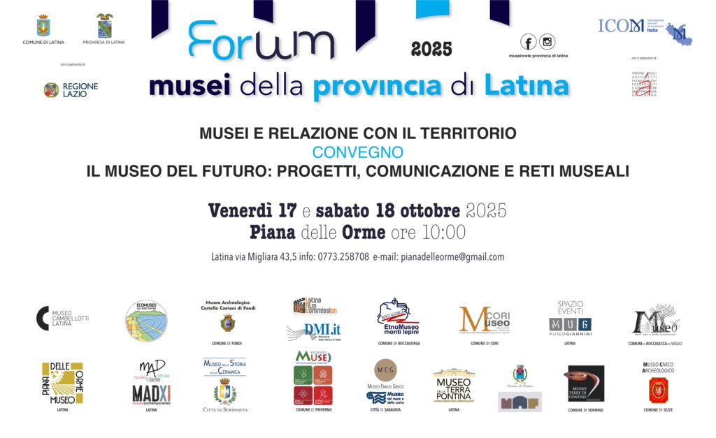 Per il secondo anno consecutivo, il Comune di Latina, capofila della Rete dei musei della provincia di Latina, ha organizzato in collaborazione con le altre istituzioni coinvolte il Forum 2025 per un approfondimento a tutto campo delle prospettive future delle istituzioni culturali del territorio. L’appuntamento è per venerdì 17 e sabato 18 ottobre prossimi, presso il Museo di Piana delle Orme, aperto alla partecipazione di tutti i musei del Lazio, agli amministratori comunali, agli operatori culturali, agli artisti, alle associazioni culturali e agli studenti degli istituti di scuola superiore. A dare il benvenuto al Forum 2025 di MuseiInRete della provincia di Latina sarà, alle ore 10 di venerdì, il direttore della struttura ospitante, Fosco Esposito. Seguiranno i saluti istituzionali del sindaco di Latina Matilde Celentano, del presidente della Provincia di Latina Gerardo Stefanelli, dell’assessore alla Cultura della Regione Lazio Simona Renata Baldassarre, del senatore Nicola Calandrini e del Prefetto di Latina Vittoria Ciaramella. Sarà cura della direttrice del museo Cambellotti Antonia Lo Rillo presentare i tavoli di partecipazione, al centro del Forum, sulla relazione dei musei con la funzione educativa, il territorio, i linguaggi d’arte e la comunicazione, digitalizzazione e catalogazione. Nel corso della stessa mattinata, si procederà alla firma del protocollo d’intesa per la rete Mir per una nuova adesione.