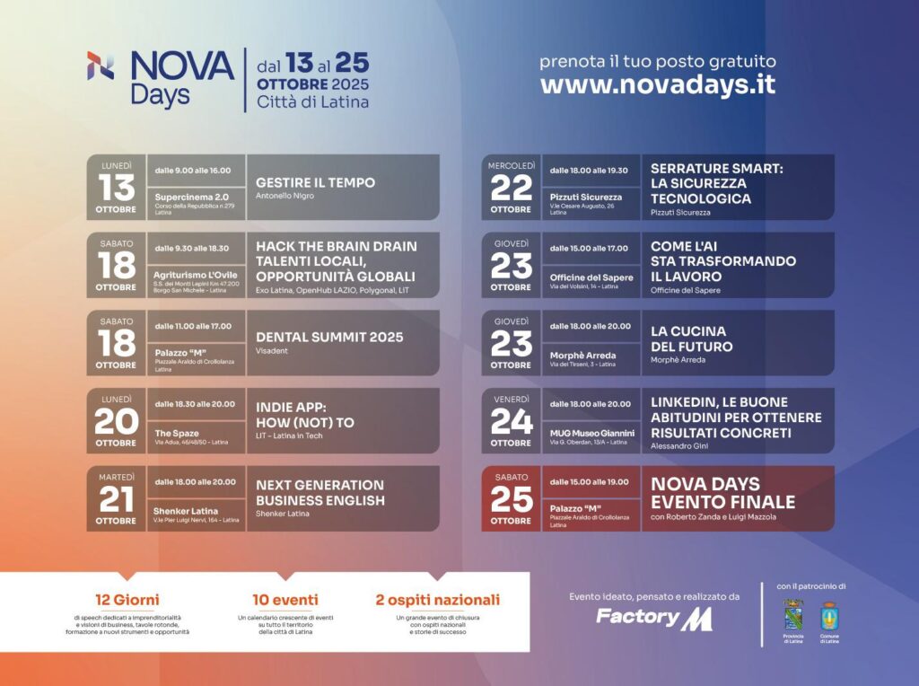 Latina diventa per dodici giorni il cuore pulsante dell’innovazione. Dal 13 al 25 ottobre si terrà Nova Days, un evento diffuso organizzato da Factory M, che mette al centro imprenditori, professionisti e giovani talenti in un percorso fatto di incontri, workshop e conferenze dedicati al futuro del business. Non un semplice evento, ma un vero movimento verso il futuro che nasce dal desiderio di creare una cultura dell’innovazione anche fuori dalle grandi metropoli, valorizzando un territorio dinamico come quello pontino e offrendo occasioni concrete di crescita e confronto. Il programma di Nova Days comprende 10 appuntamenti gratuiti distribuiti in diversi spazi della città di Latina: dalle aule formative agli spazi istituzionali, fino a luoghi simbolo della comunità. I temi al centro degli incontri spaziano dall’intelligenza artificiale all’imprenditoria digitale, dall’evoluzione delle tecnologie alla gestione del tempo e delle risorse, fino al networking e alle strategie per competere in mercati sempre più complessi.