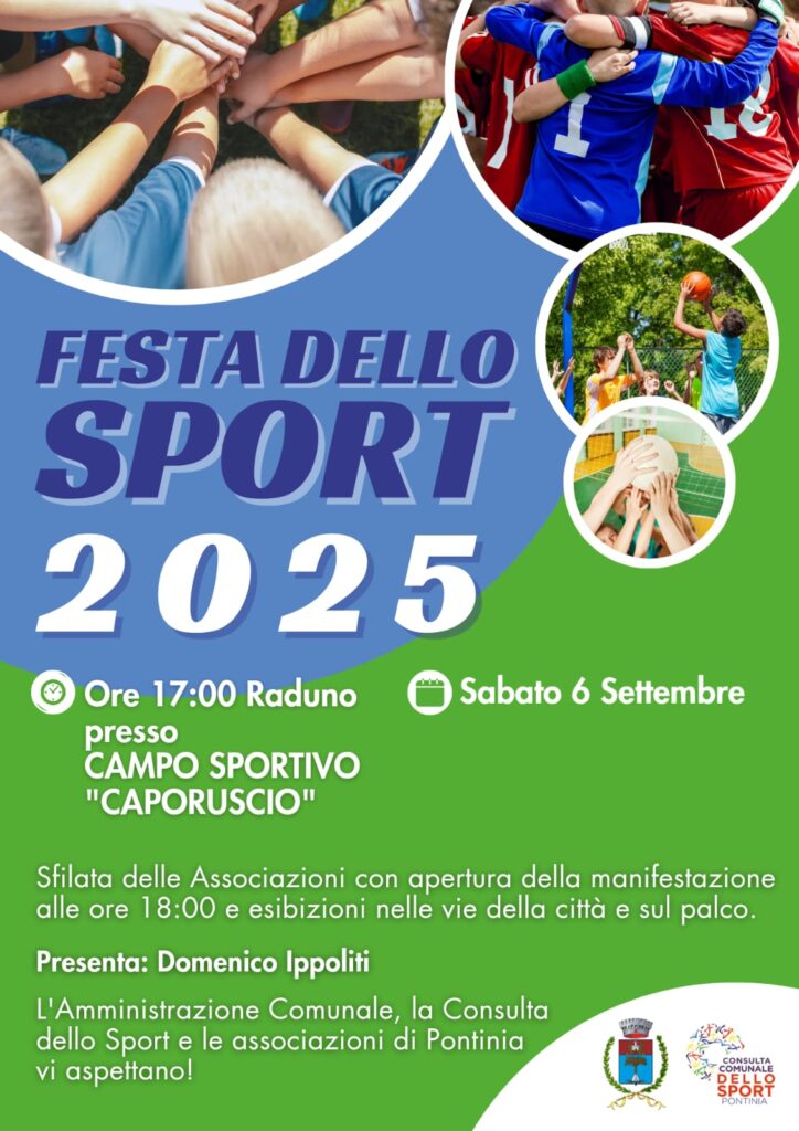 Tutto pronto a Pontinia per la decima edizione della “Festa dello Sport”, prestigiosa passerella organizzata dall’Amministrazione Comunale e dalla Consulta dello Sport e dedicata alle associazioni del territorio operanti in svariate discipline. L’appuntamento, fissato per sabato 6 settembre, vedrà il coinvolgimento di oltre trenta realtà: ad ognuna sarà assegnata una postazione nelle vie del centro da utilizzare per dimostrazioni ed esibizioni. Sul palco di piazza Indipendenza, inoltre, offriranno spettacolari performances scuole di danza e di ballo e artisti di ogni genere. La manifestazione è entrata ormai a far parte delle tradizioni cittadine, come evidenziato dal delegato allo Sport Simone Coco: “In questi ultimi anni abbiamo puntato a modificare e potenziare un appuntamento ormai molto sentito, insistendo sempre su un doppio obbiettivo: consegnare una preziosa ribalta alle tante realtà che operano sul nostro territorio e consentire ai giovani e anche ai meno giovani di scoprire e conoscere delle discipline da praticare per il loro benessere ed il loro tempo libero”.  Entusiasta anche la presidentessa della Consulta dello Sport, Michela Zanutel: “Si tratta per me della terza edizione da presidente e ogni anno è un carico di emozioni e di adrenalina nel curare tutti i preparativi e nel coinvolgere il maggior numero di associazioni e atleti. Crediamo molto nello sport come strumento per promuovere l’aggregazione e i più sani principi tra i giovani. Anche stavolta, inoltre, abbiamo posto l’inclusione e la solidarietà tra le nostre priorità: ospiteremo diverse realtà che si occupano di persone diversamente abili e saremo felici di donare loro un’emozionante vetrina. Visto che la nostra festa segna di fatto l’inizio della nuova stagione, auguro a tutti i protagonisti un anno sportivo ricco di successi!”.