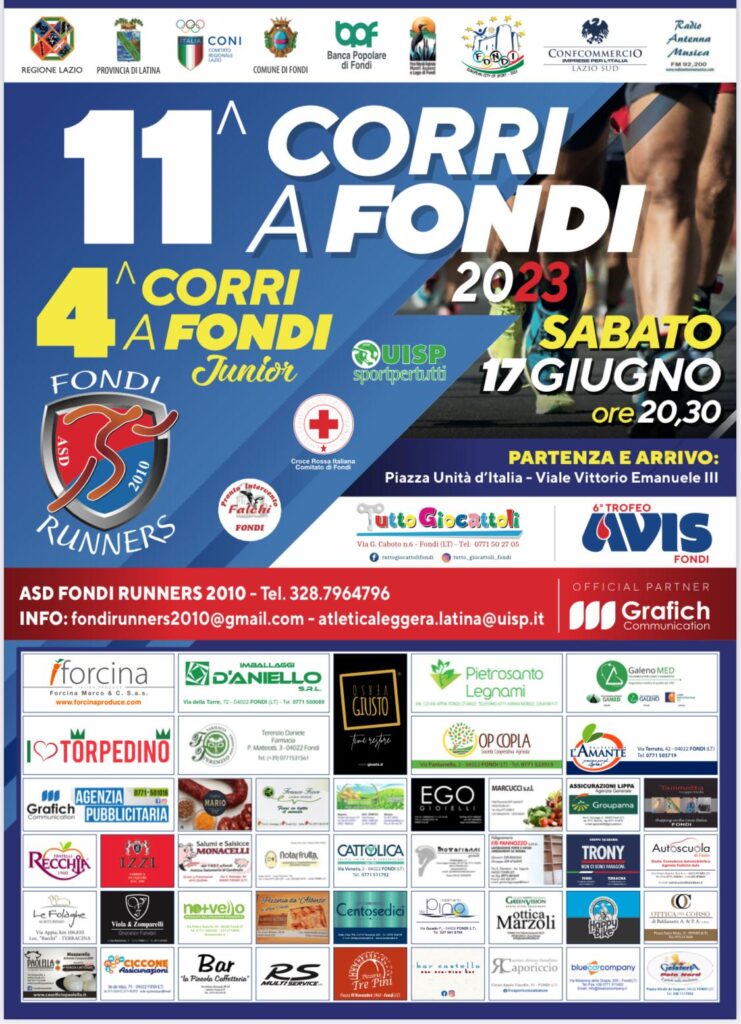 Questo spostamento di orario ha comportato un’ottima risposta della città e in particolare dei commercianti, provocando criticità decisamente minori per il traffico locale. Sabato 17 giugno si correrà sulla distanza di 10 chilometri, in un percorso interamente urbano suddiviso in quattro giri: gli organizzatori hanno preferito rimanere all’interno del centro, preferendo più passaggi nella piazza centrale e sul corso principale. Fiore all’occhiello della manifestazione è sicuramente il coinvolgimento dei più piccoli, reso possibile grazie alla “Corri a Fondi Junior”.