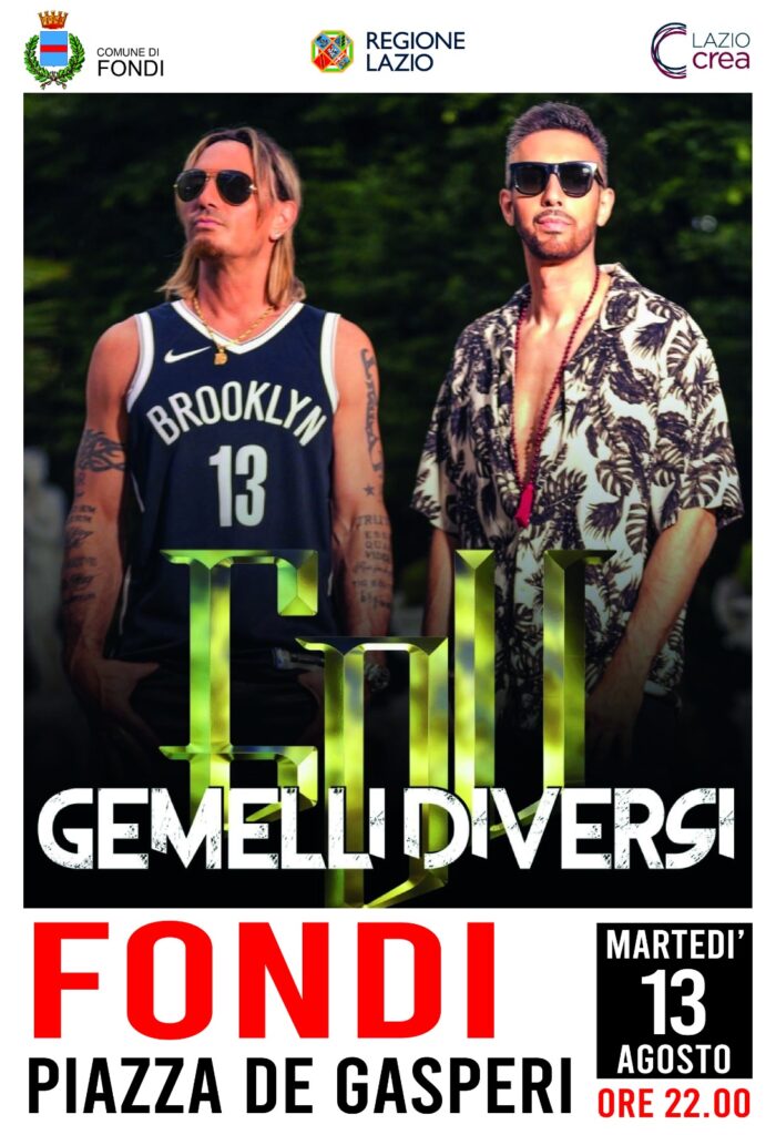 Tra eventi sold out, piazze stracolme e applauditissime performance artistiche prosegue il cartellone estivo “Un mare di eventi… a Fondi”. La serata più attesa della stagione è in programma martedì 13 agosto quando a calcare il palcoscenico di Piazza De Gasperi saranno i Gemelli Diversi. Un grande concerto dedicato ai cittadini e ai turisti, tutto da vivere e da cantare, nell’ampia cornice dell’anfiteatro. Strano e Thema ripercorreranno oltre 25 anni di grandi successi che hanno fatto sognare generazioni e che hanno segnato indelebilmente gli anni duemila.